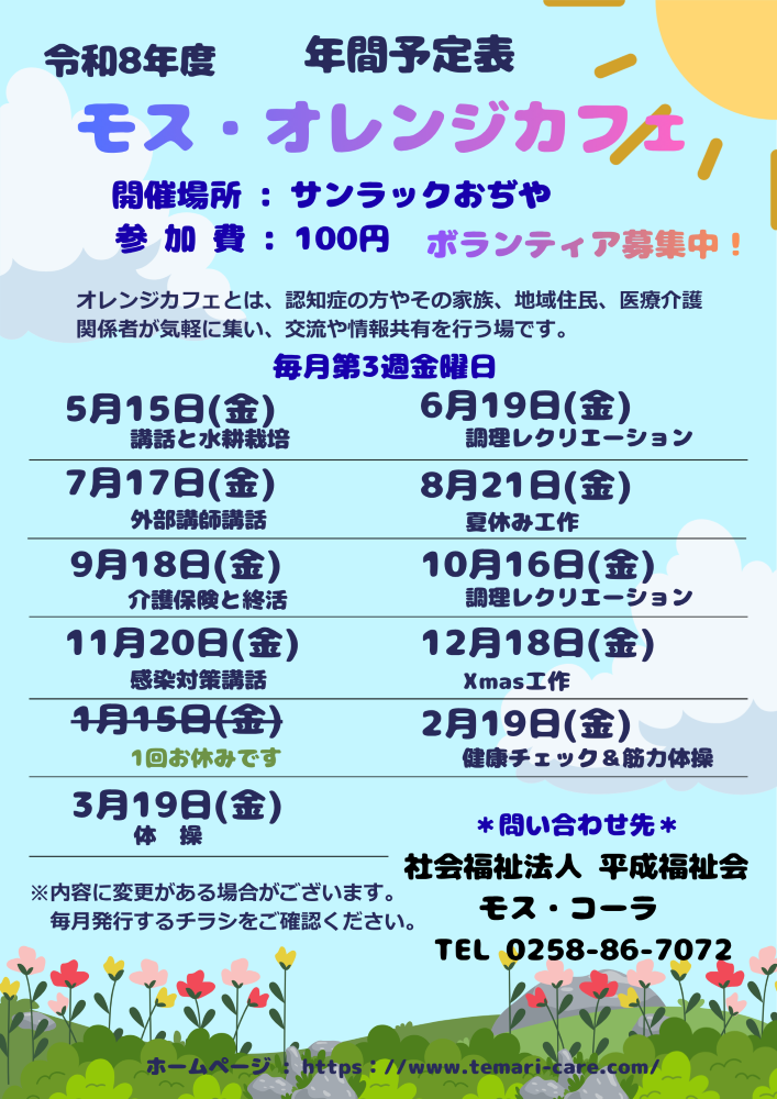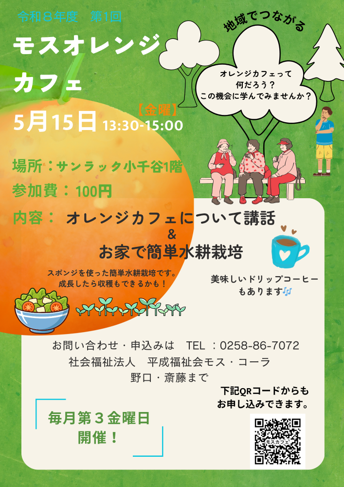令和8年度 第1回モスオレンジカフェを開催いたします。令和8年5月15日(木曜日)13:30~15:00会場:サンラックおぢや 1階 創作活動室内容:「オレンジカフェって何?&お家で簡単水耕栽培」今年も一年間よろしくお願いいたします。第1回目はオレンジカフェって何?と水耕栽培です。手軽にできる水耕栽培で野菜やハーブを育てませんか?どうぞお気軽にご参加ください。