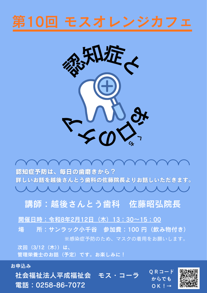令和7年度 第10回モスオレンジカフェを開催いたします。令和8年2月12日(木曜日)13:30~15:00会場:サンラックおぢや 1階 創作活動室内容:「認知症とお口のケア」今回は、越後さんとう歯科診療所 医院長の佐藤昭弘様をお迎えし、ご講話いただきます。貴重なお時間をぜひご一緒に!どうぞお気軽にご参加ください。