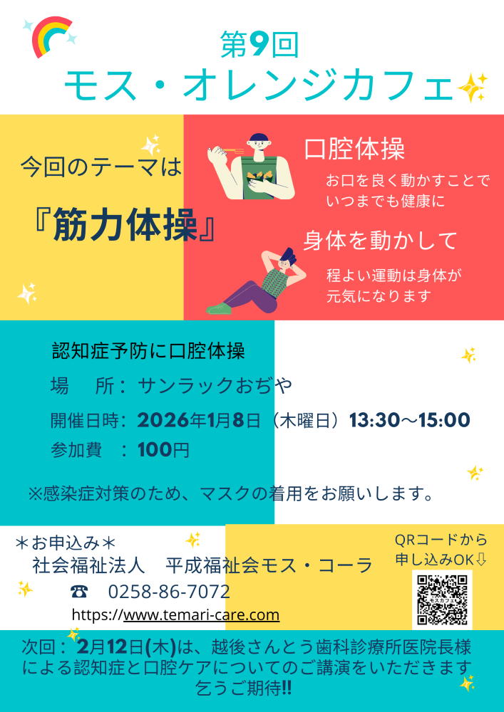 令和7年度 第9回モスオレンジカフェを開催いたします。令和8年1月8日(木曜日)13:30~15:00会場:サンラックおぢや 1階 創作活動室内容:「筋力体操」寒さに負けない体づくりを行います。口腔体操をメインに心も体も健康に!今回も為になる、楽しめる内容となっておりますので、ご夫婦やご友人などとぜひお気軽にご参加ください。