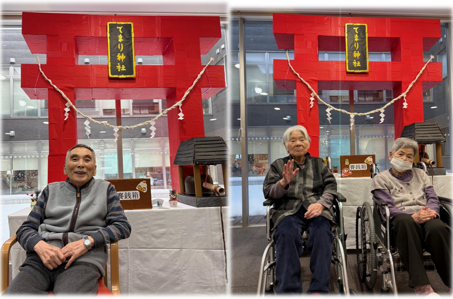 最近の出来事2026/01/25てまり総合ケアセンター【てまり特別養護老人ホーム】新年を迎え、皆さまと一緒にてまり神社で初詣。それぞれ願いを込め、お参りをされていました。ユニットでは、思い思いの言葉を筆にした書初めを楽しんでいただきました。神楽で無病息災を願い、穏やかな一年の始まりとなりました。