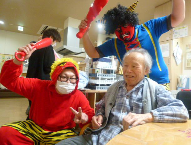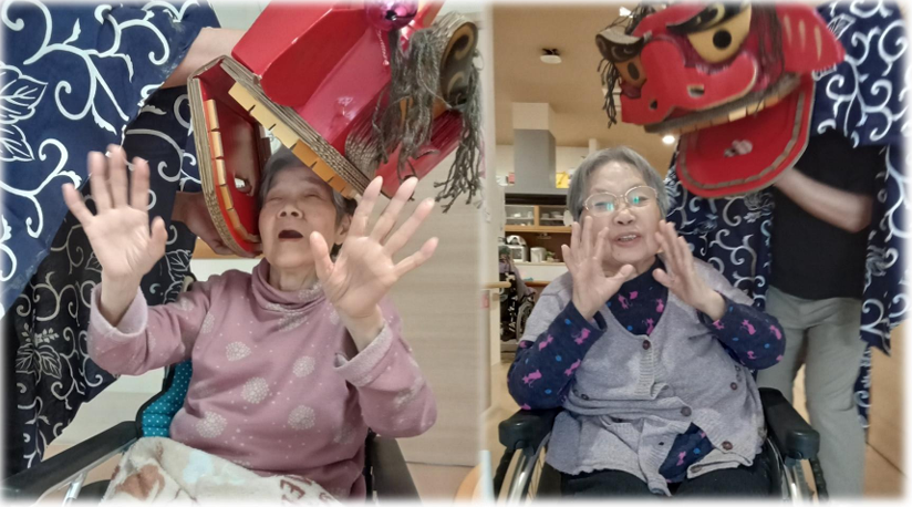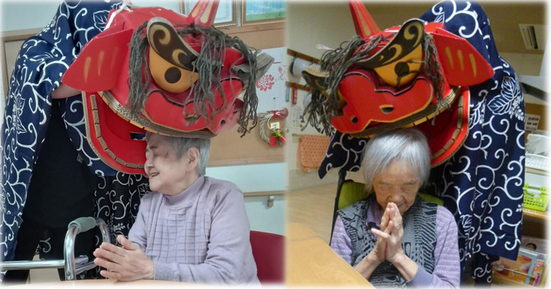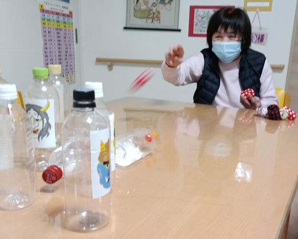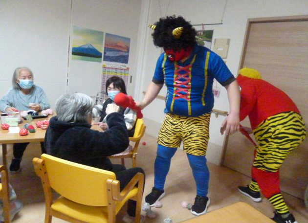 最近の出来事2026/02/19てまり総合ケアセンター【てまりショートステイ】節分行事を行いました。赤鬼と青鬼が登場すると大盛り上がり!鬼のイラストを貼り付けたペットボトルに向かってお手玉を投げつけ鬼退治をしました。